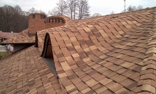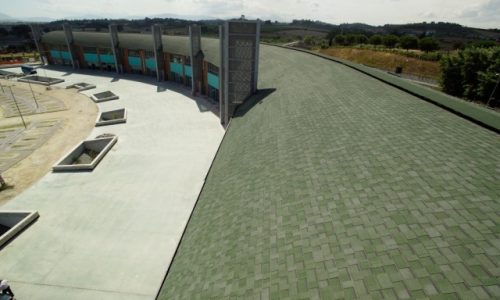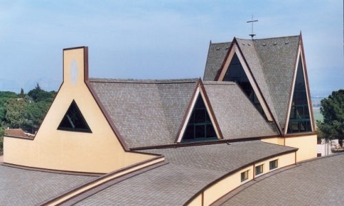 Μια κατασκευή δύο στρωμάτων αναπαριστά, με μια ολοκαίνουργια τεχνολογία, παραδοσιακές στέγες φτιαγμένες από ξύλο, σχιστόλιθο, πέτρα κτλ