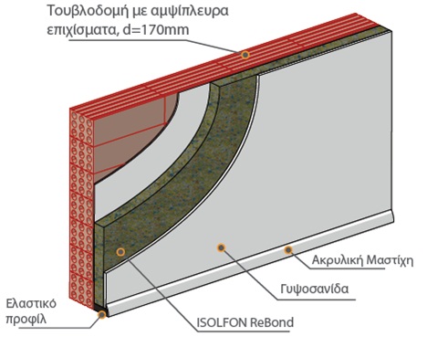 Στο τελευταίο σχεδιάγραμμα παρουσιάζεται η τελική τοποθέτηση του ISOLFON ReBond για τελική ηχομόνωση τοίχου.