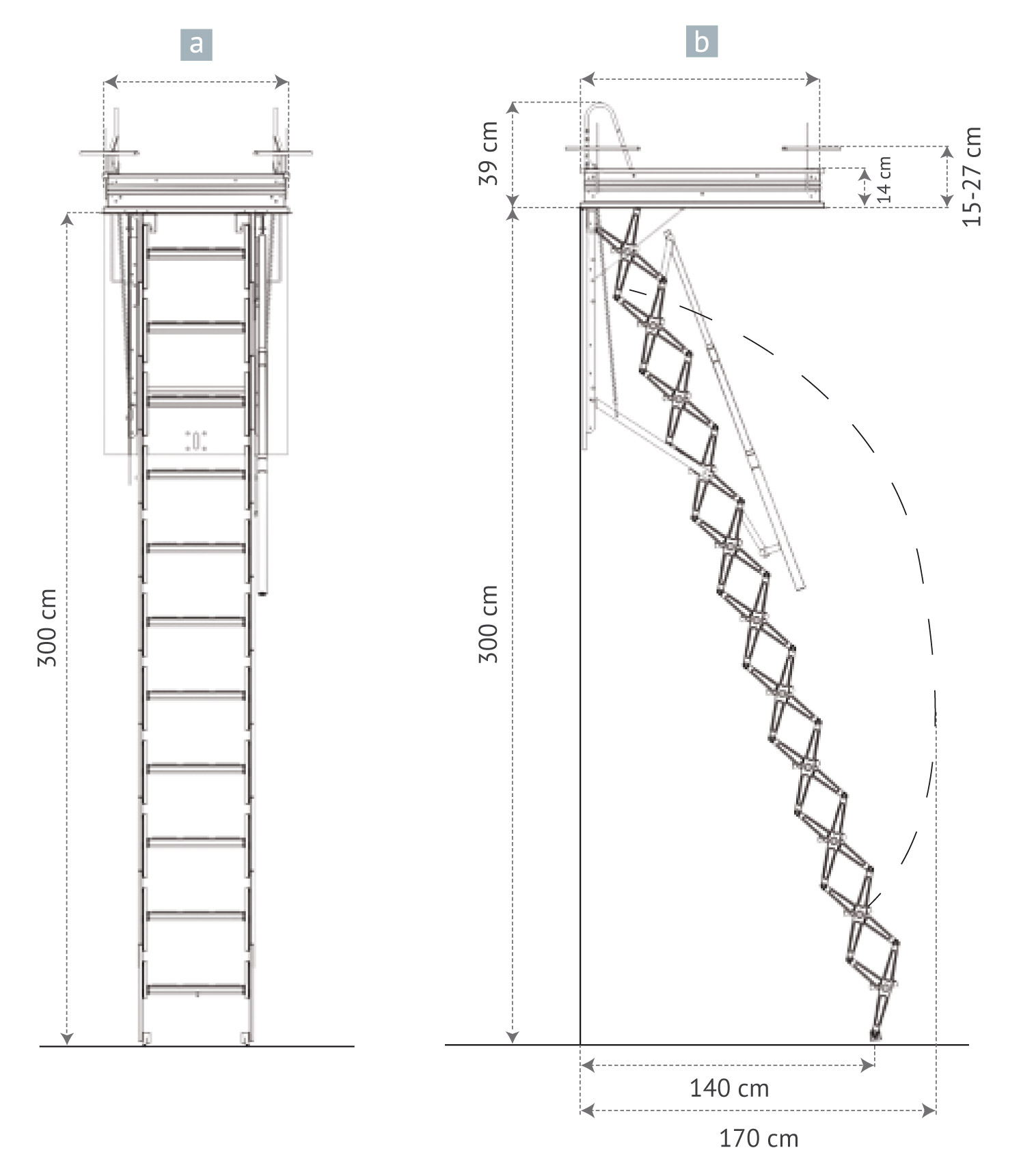Ολοκληρωµένη, ασφαλής και οικονοµική σκάλα οροφής τύπου φυσαρμόνικα. Διατίθεται σε µεγάλη ποικιλία διαστάσεων ώστε να καλύπτει όλες τις απαιτήσεις.