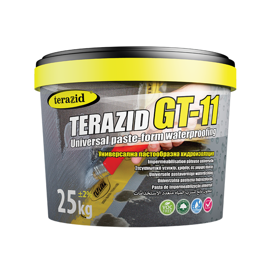 Το Terazid GT11 είναι σχεδιασµένο για στεγανοποίηση όλων των στοιχείων του κτιρίου σε στέγες, κεκλιµένες ή µη παρέχοντας µία ενιαία ελαστική στρώση στεγανοποίησης χωρίς αρµούς. Εφαρµόζεται σε ποικίλους εσωτερικούς χώρους, κάτω από κεραµικά πλακάκια όπως µπάνια, πλυσταριά, σάουνες κ.λ.π, καθώς και σε εξωτερικούς χώρους όπως µπαλκόνια, ταράτσες, επίπεδες στέγες. Χρησιµοποιείται για την στεγάνωση περιµετρικών τοιχίων και για εφαρµογή σε όποιες επικαλύπτονται από χώµα.