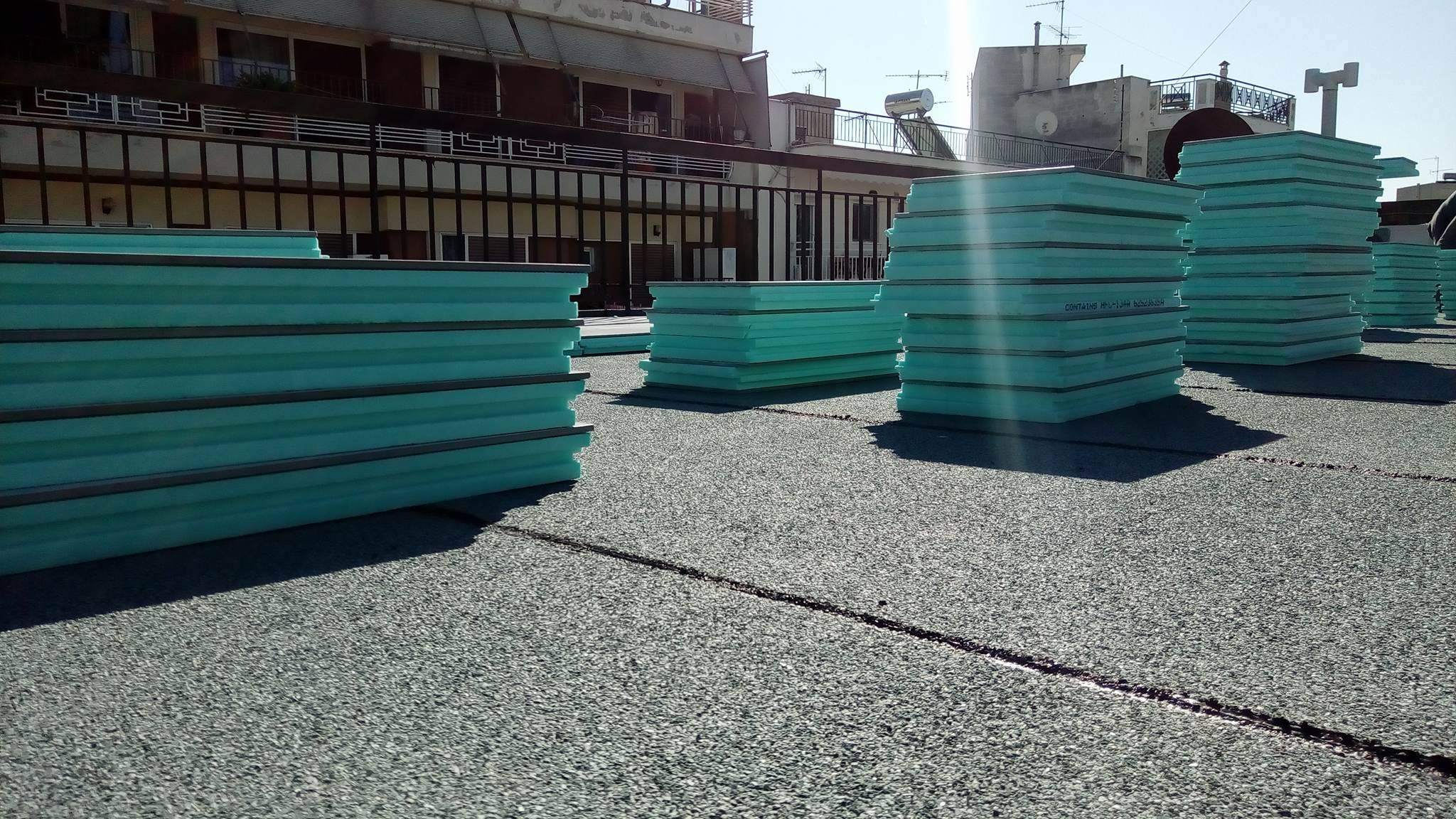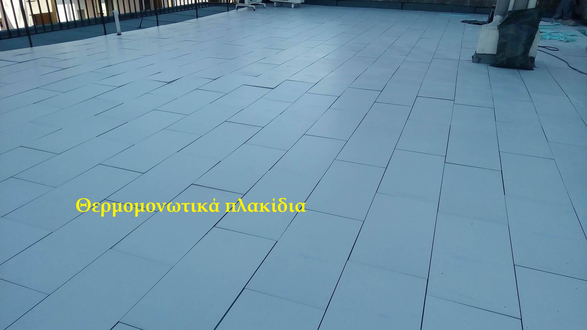 - Τοποθετούμε τα θερμομονωτικά πλακίδια κολλώντας τα περιμετρικά του δώματος και όπου αλλού κριθεί απαραίτητο με ειδική κόλλα, για να βελτιωθεί η σταθερότητα και η βατότητα του δώματος.